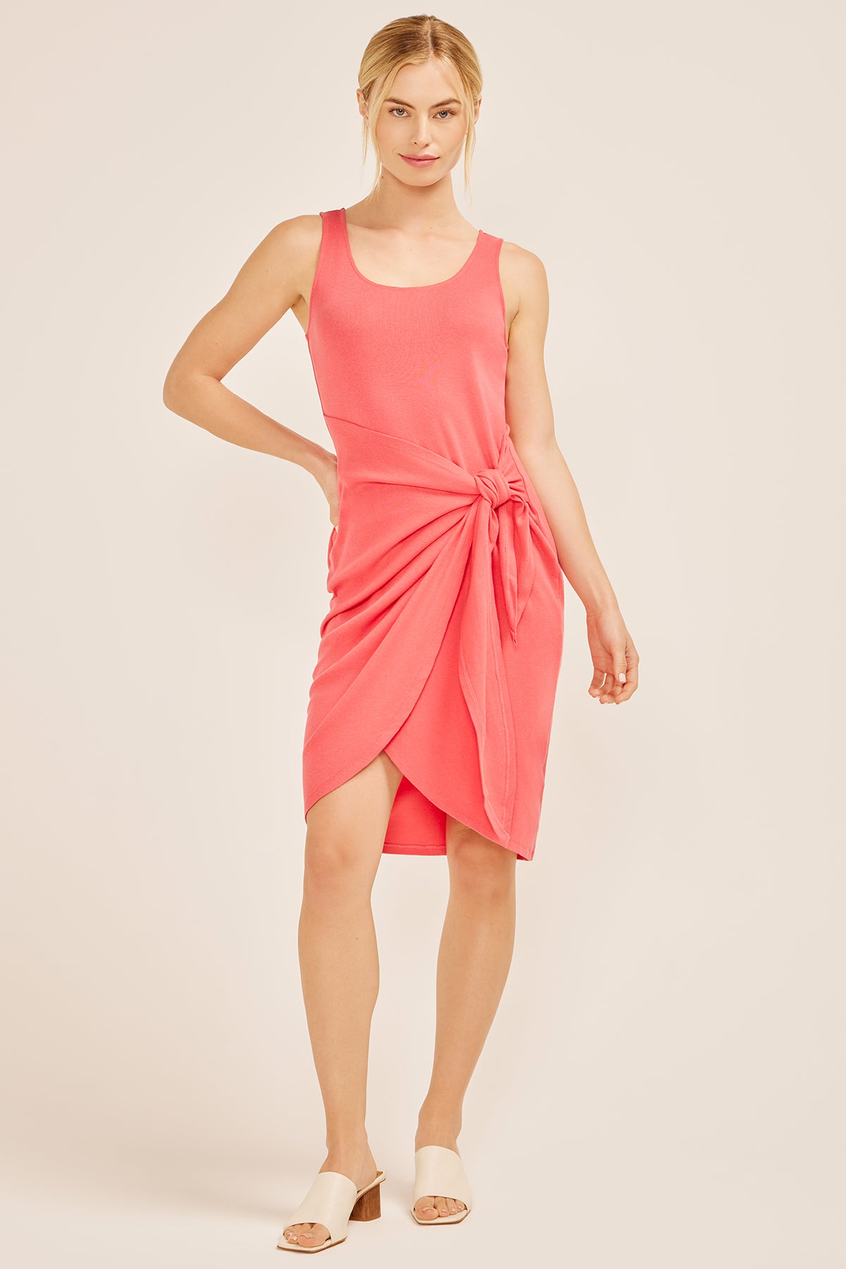 A class silhouette, this cotton-blend wrap-skirt dress features a scoop neck, tulip hem, and side self-tie detail.