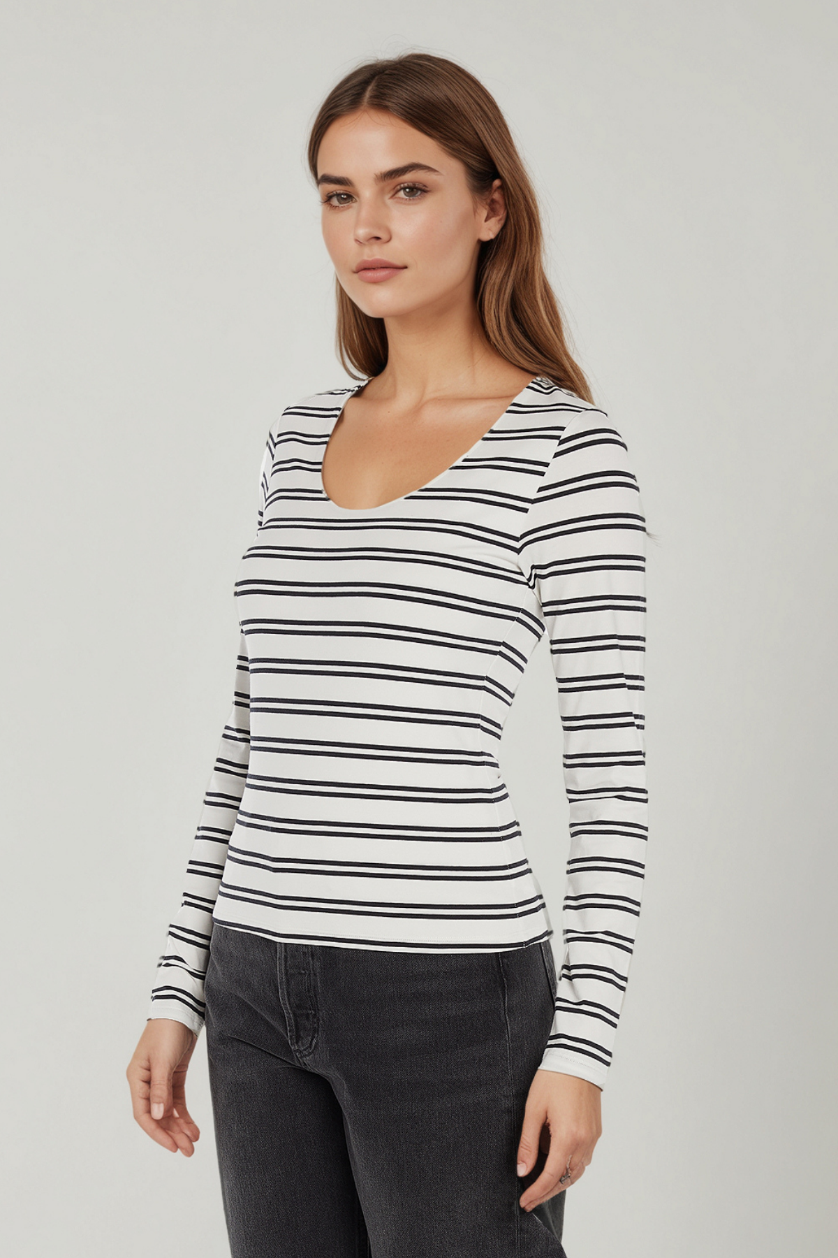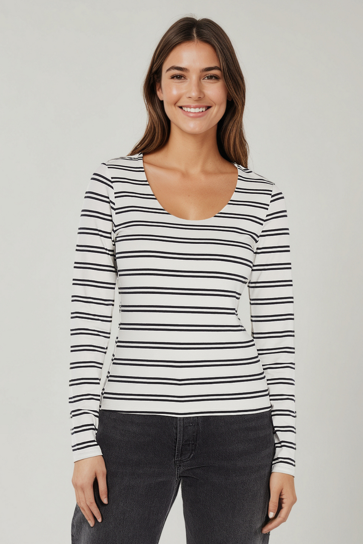 Scoop Neck Long Sleeve Tee | Egret Black Beauty Stripe