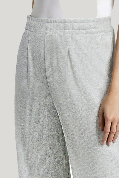Cool, comfy, and effortlessly stylish! These soft heather grey textured wide-leg pants bring relaxed sophistication to your everyday wardrobe. With a stretchy waistband and easy pleats, they’re perfect for lounging or stepping out in elevated ease.