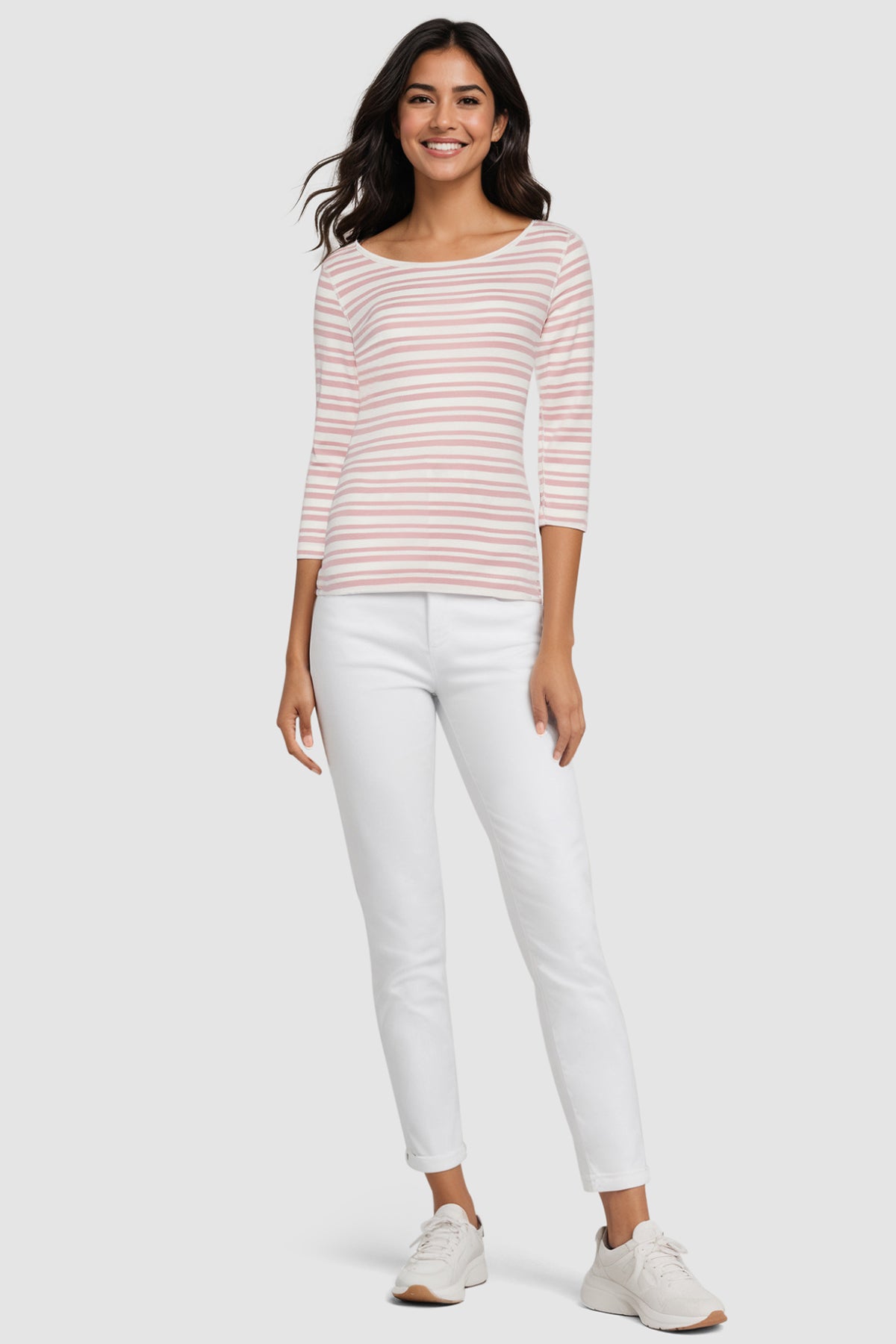 This easy cotton tee is a comfortable wardrobe staple with an elegant flair — featuring a boatneck, three-quarter sleeves, and a semi-fitted silhouette.