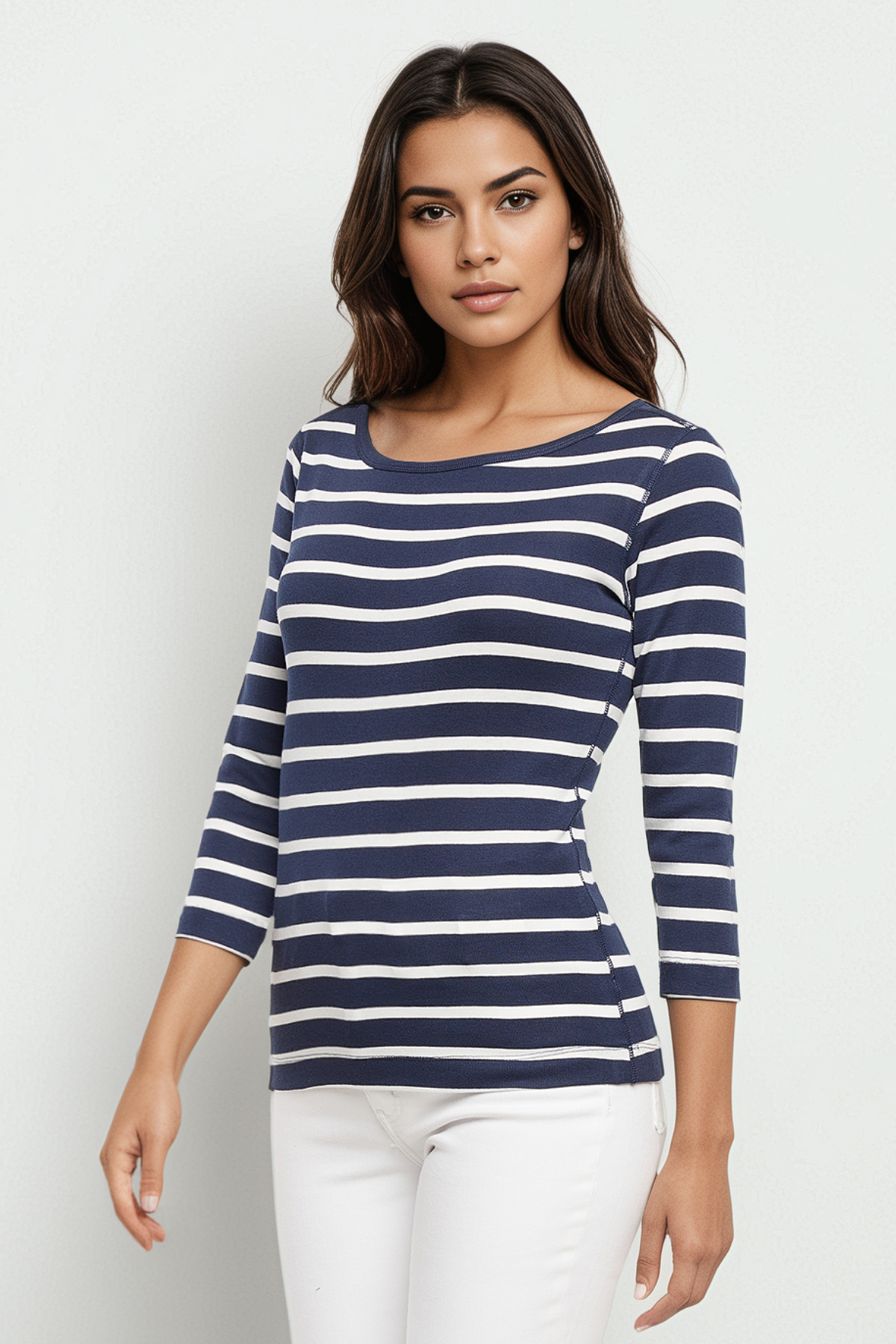 This easy cotton tee is a comfortable wardrobe staple with an elegant flair — featuring a boatneck, three-quarter sleeves, and a semi-fitted silhouette.