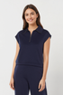 Crafted in soft and smooth scuba fabric, this relaxed-fit top features short cap sleeves and a high mockneck with a front zipper, which can transform it into a foldover collar.