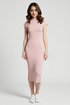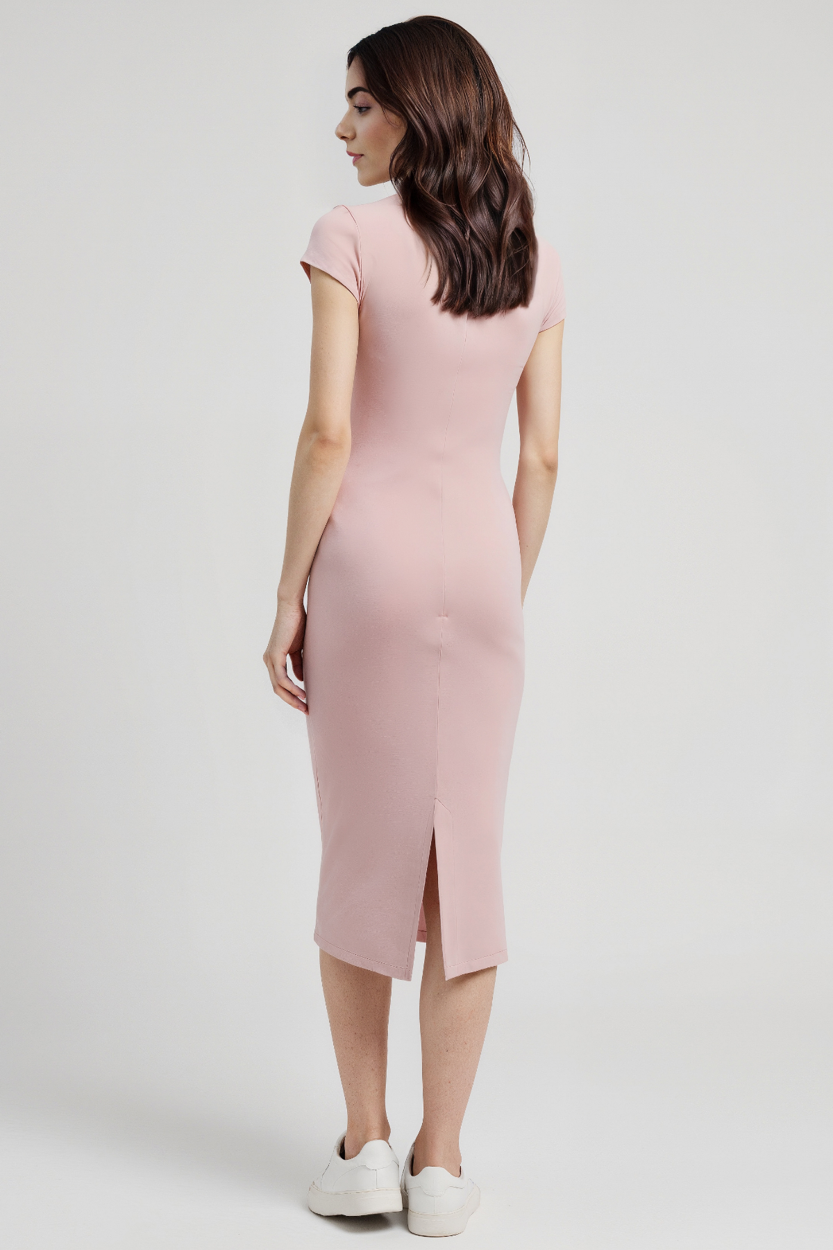 The Joelle dress is a sleek, blush-toned midi dress that hugs in all the right places with its clean lines and high neckline. The cap sleeves add charm, with a back slit that brings a fun, modern twist to this polished yet playful look.