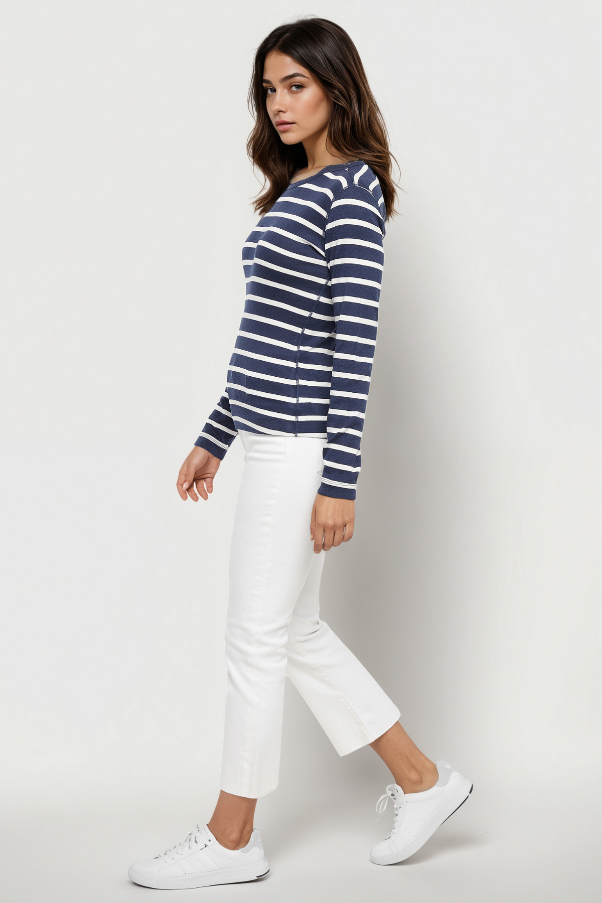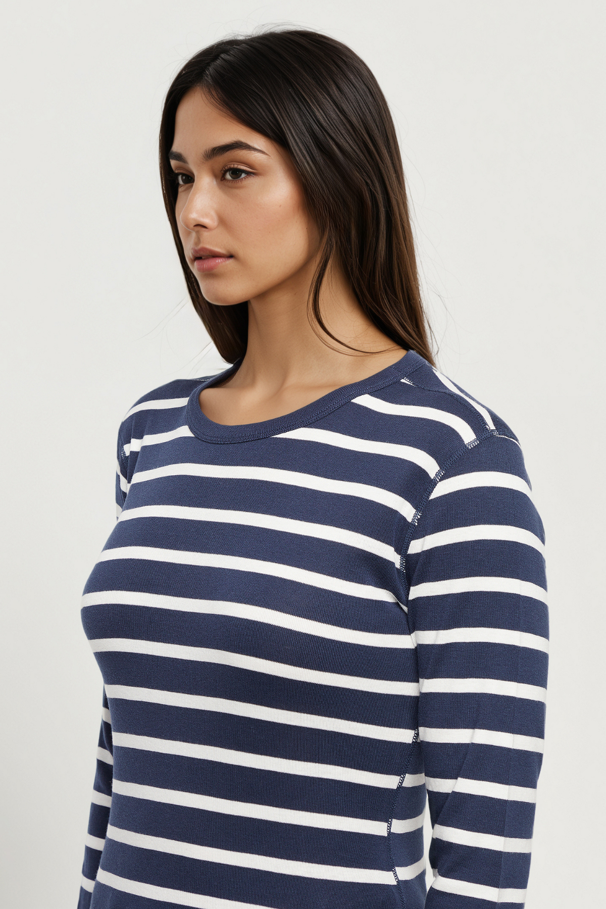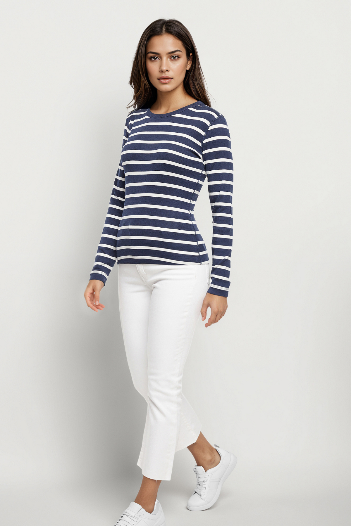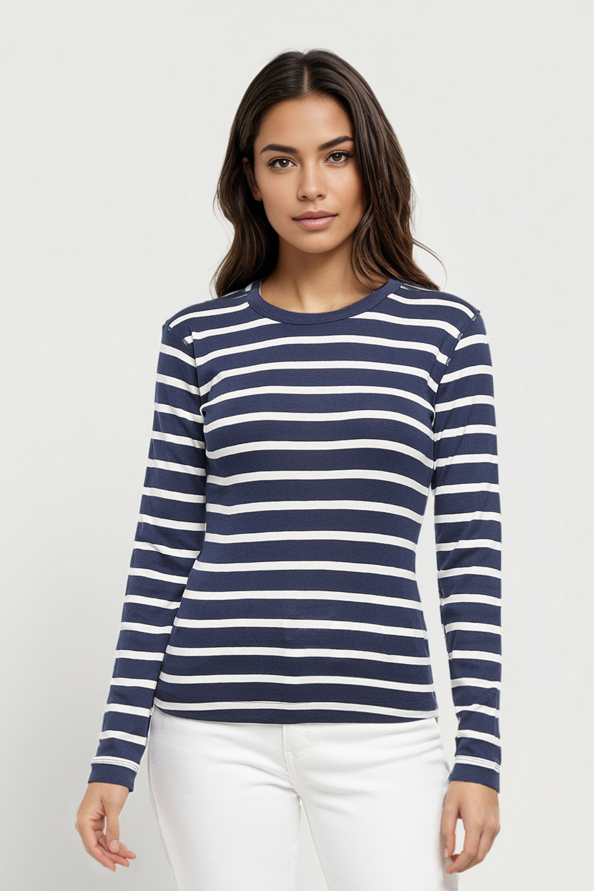 Ribbed Crew-Neck Long Sleeve Tee | Navy Blazer Mel Stripes