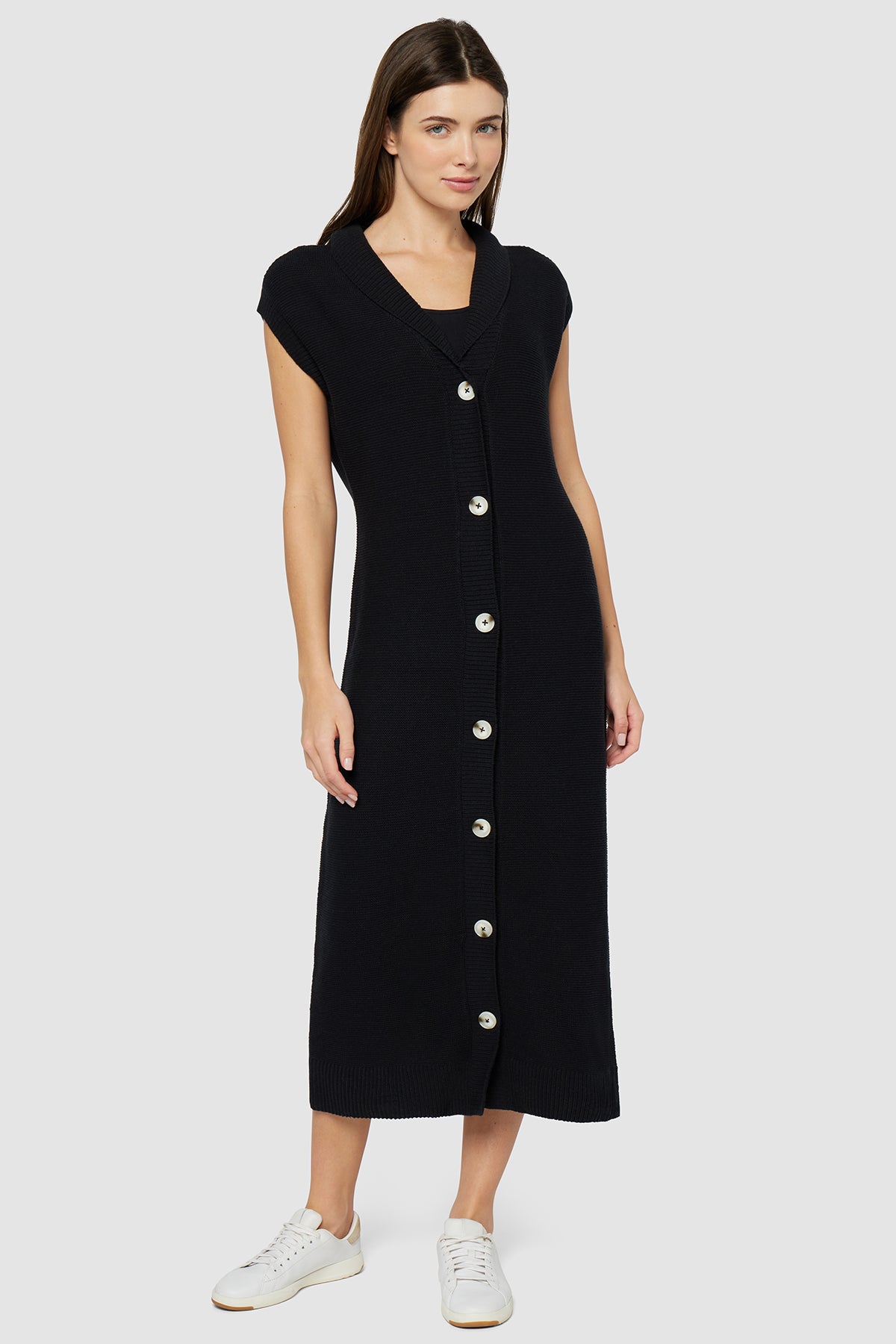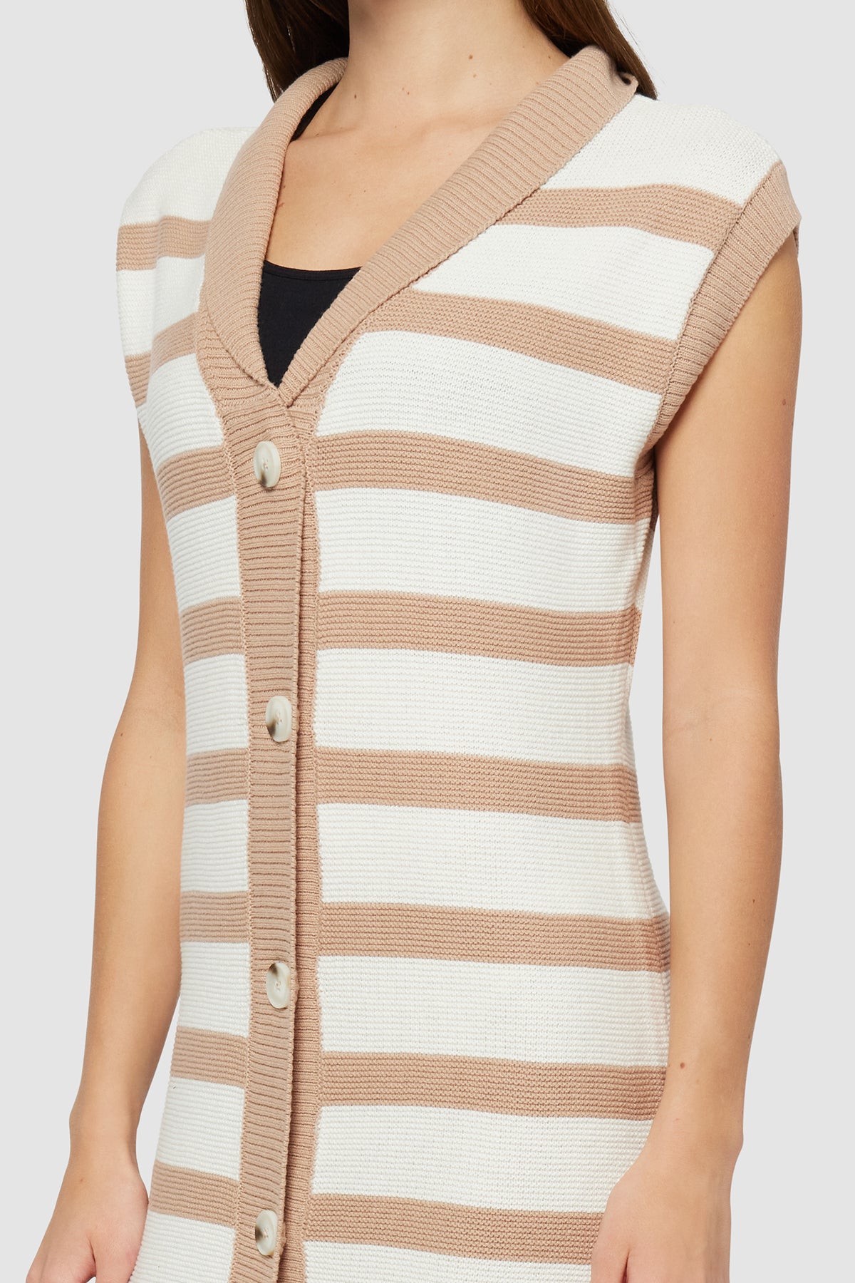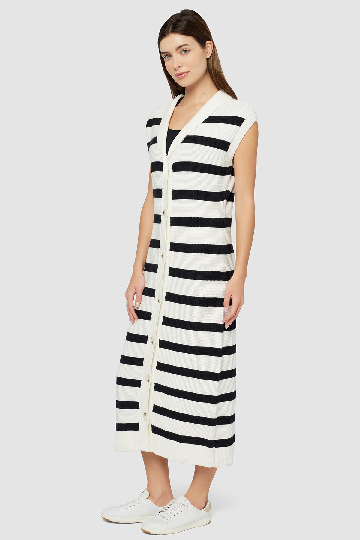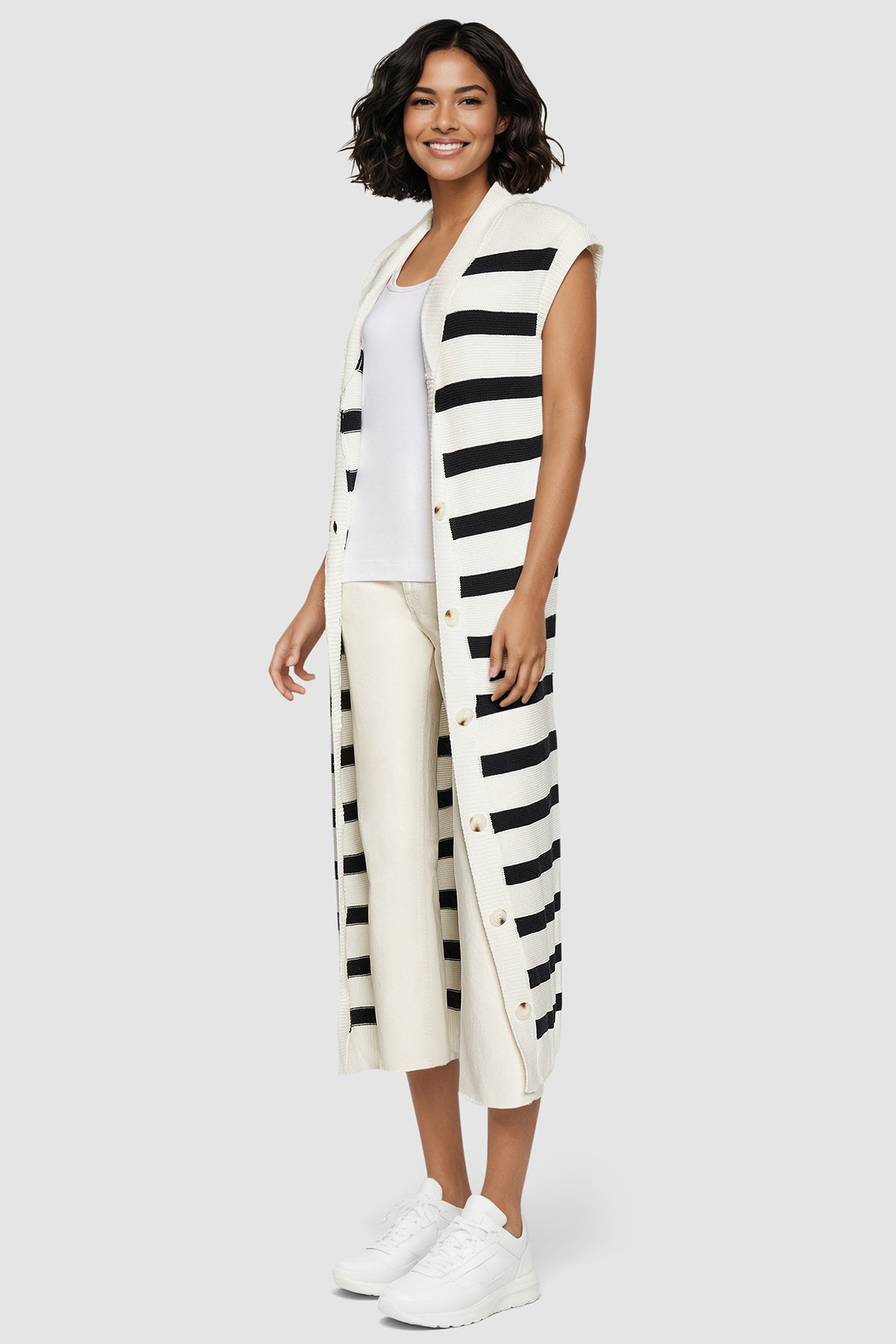 A versatile, statement-making style that can be worn as a dress or a sweater, this sleeveless knit duster features a ribbed V-neckline, a full-length placket of buttons down the front, and two-toned stripes throughout.