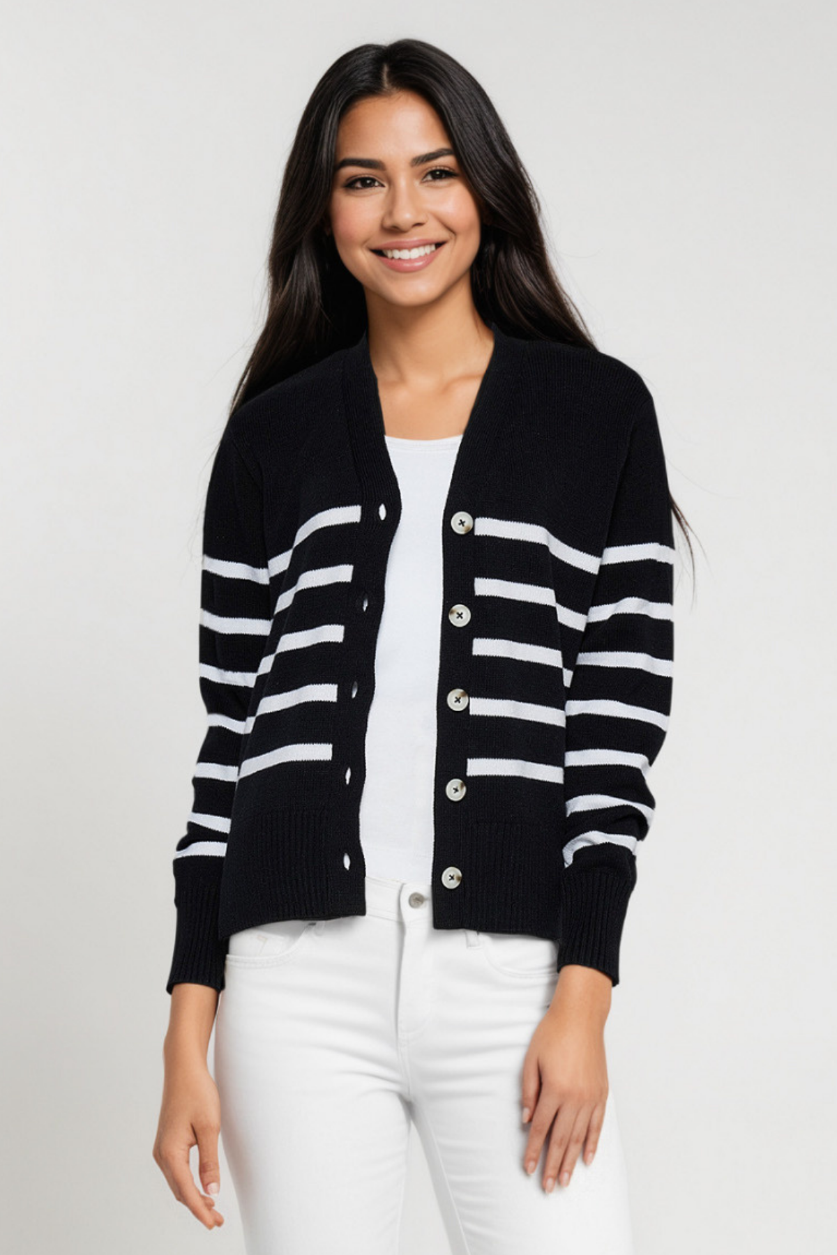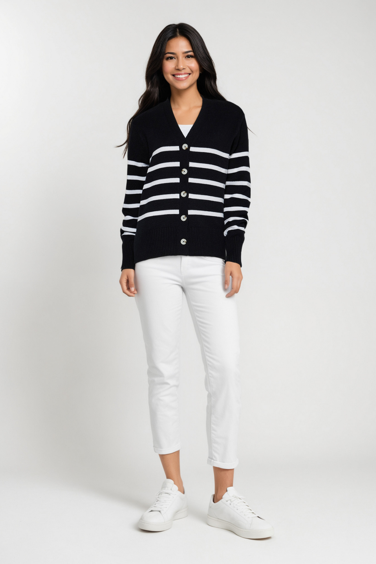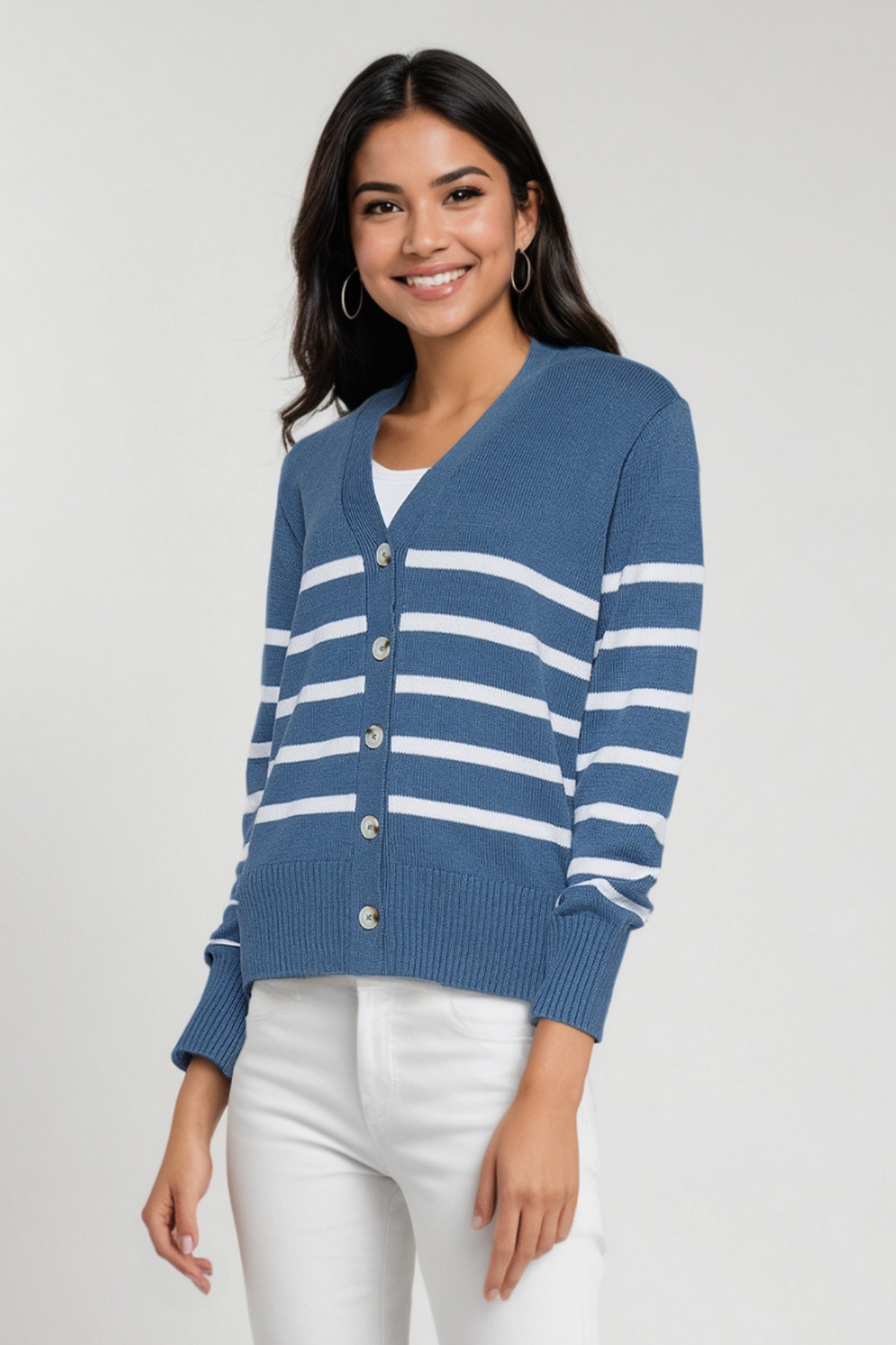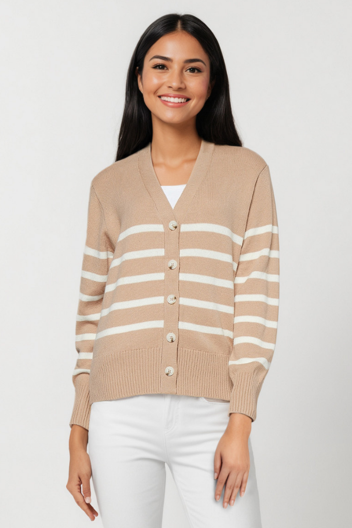 A relaxed fit with a V-neckline, this sweater-knit cardigan features a button-up front, long sleeves with rib knit cuffs, a matching bottom hem, and horizontal stripes for a two-toned look.