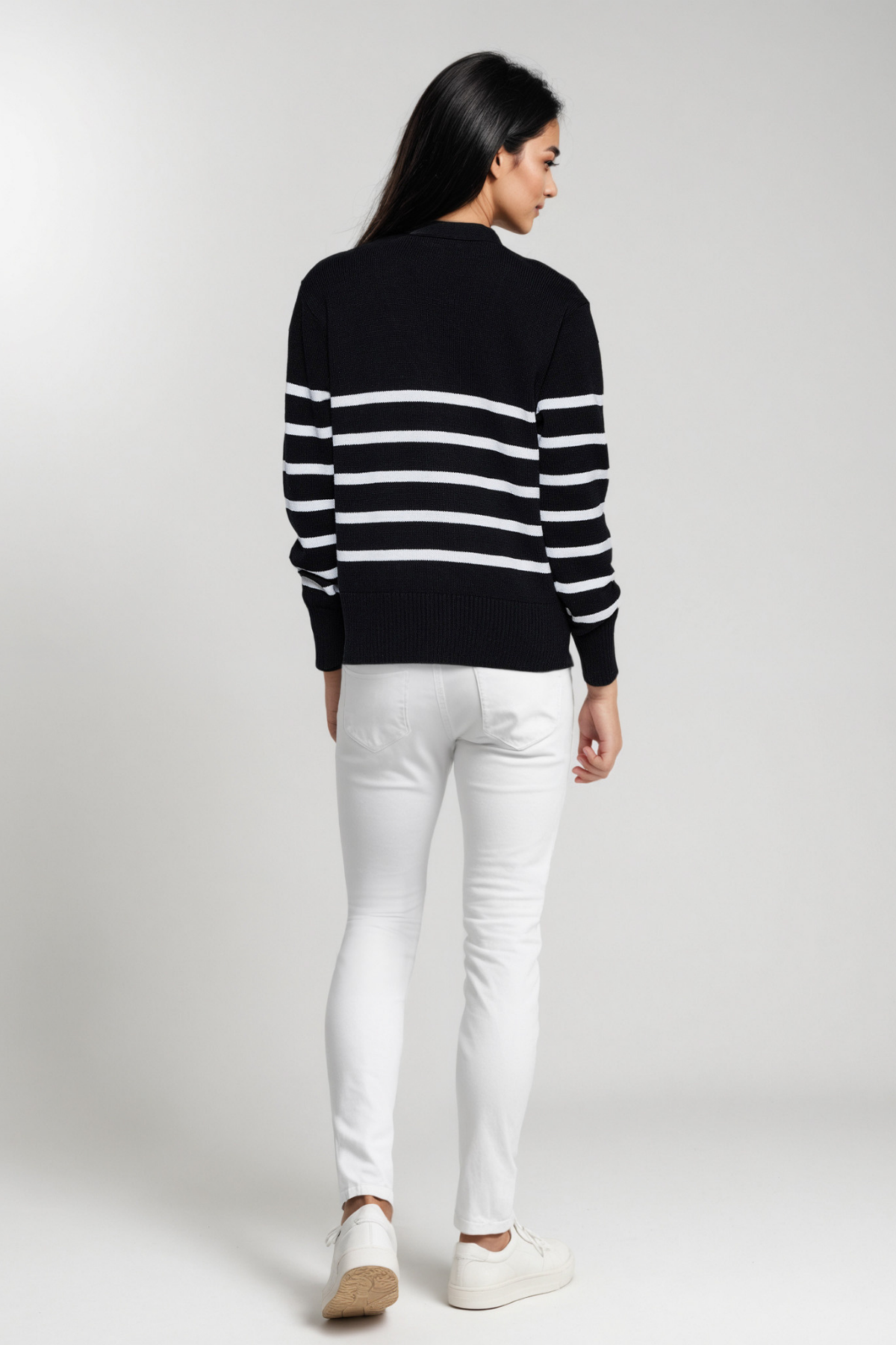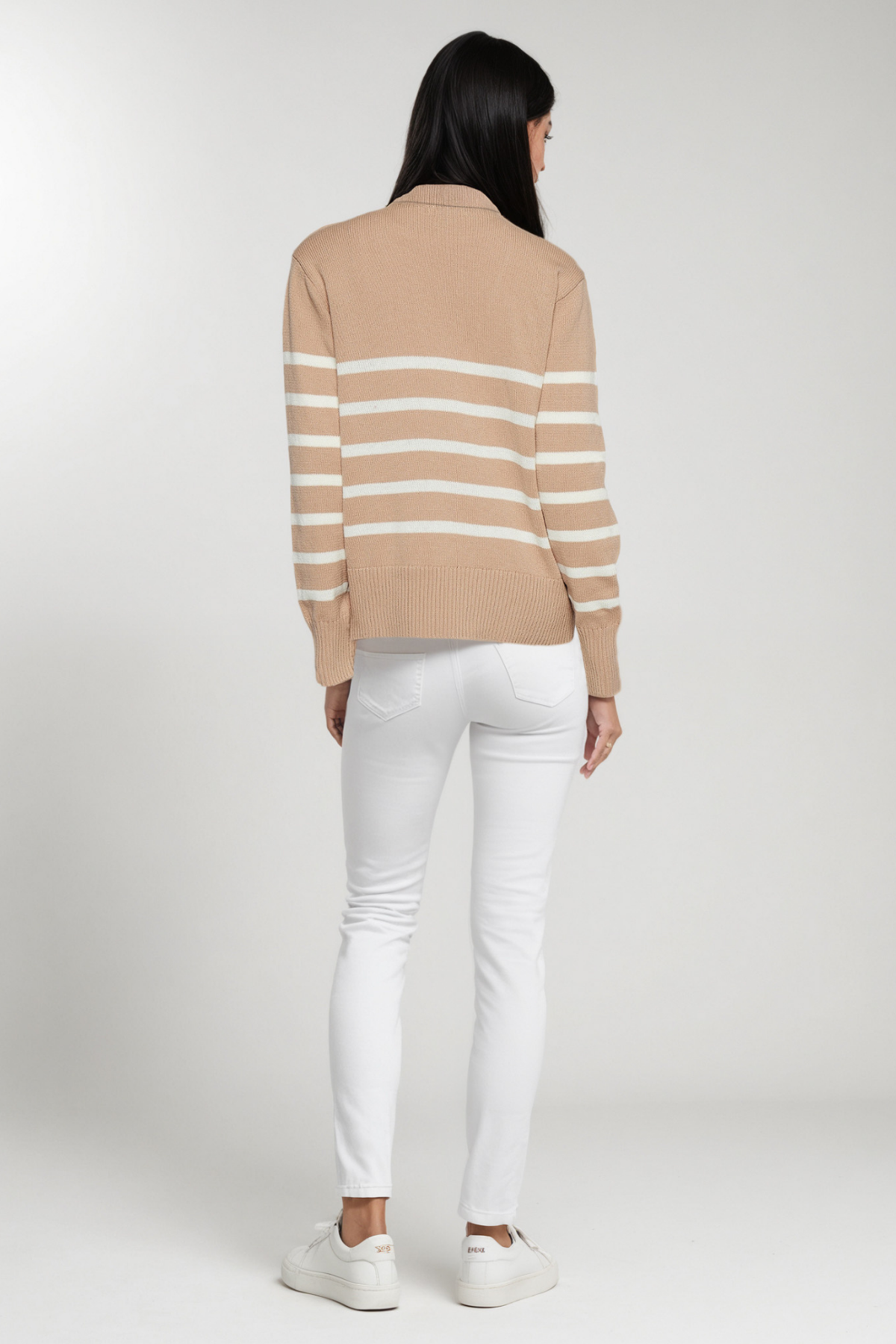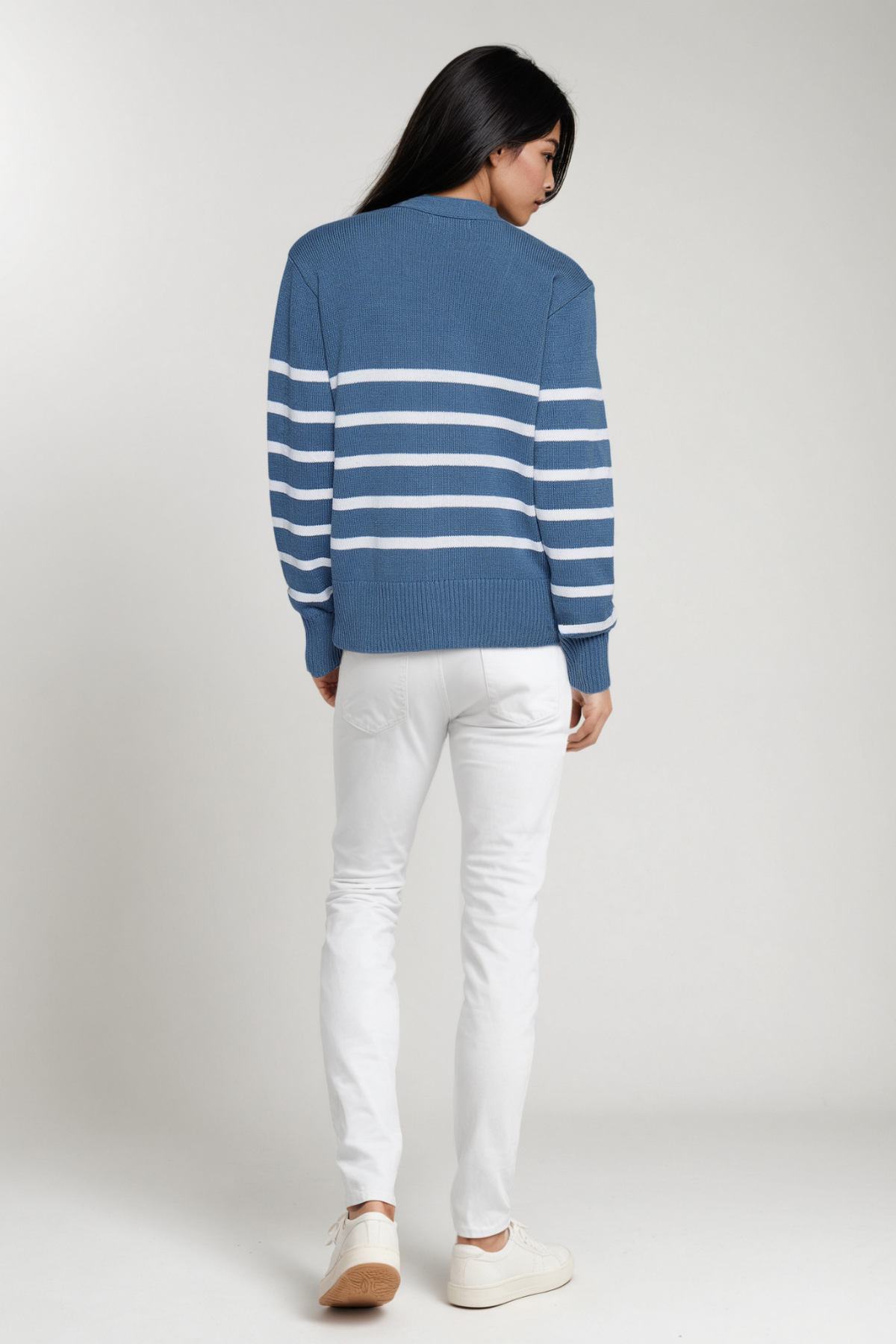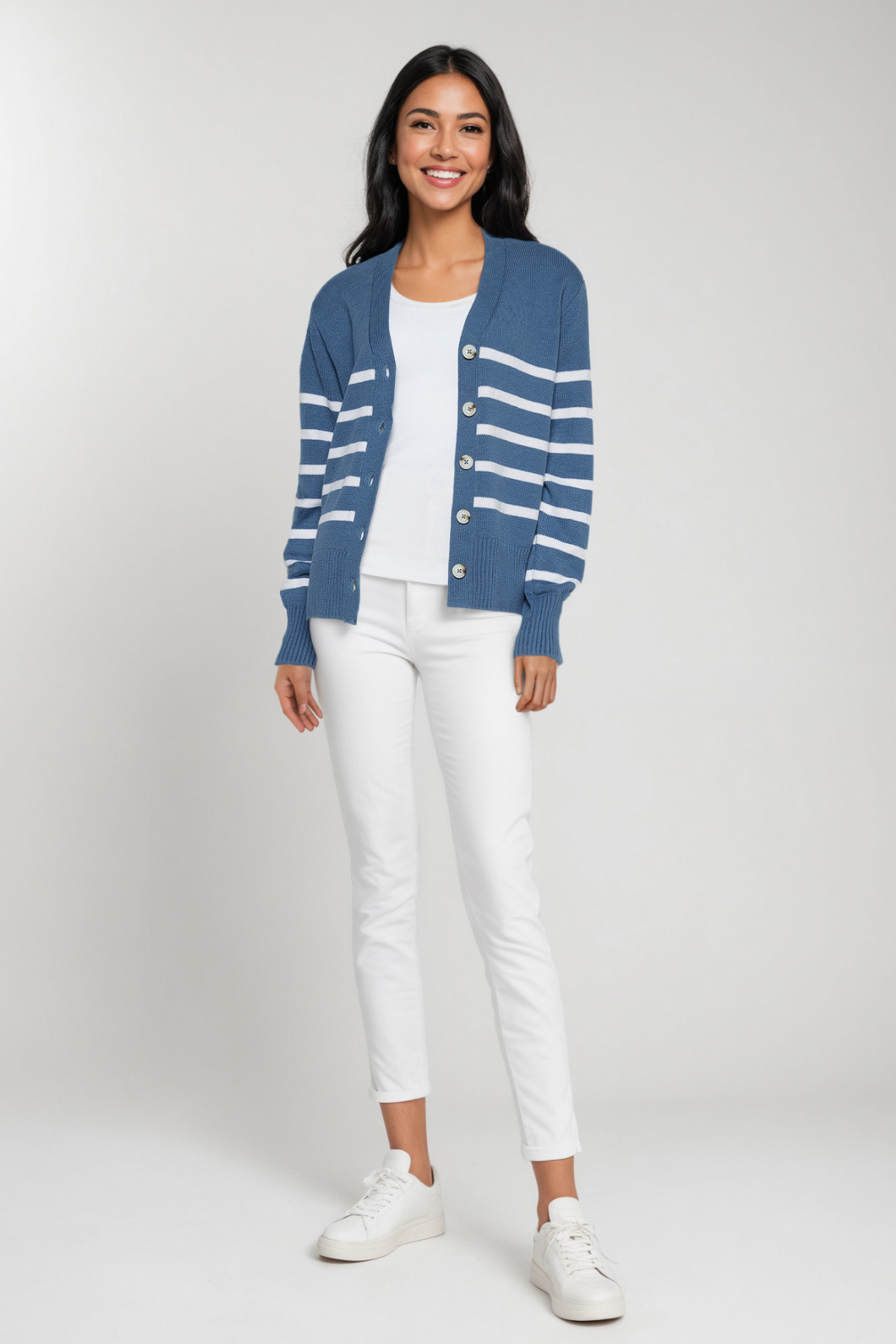 A relaxed fit with a V-neckline, this sweater-knit cardigan features a button-up front, long sleeves with rib knit cuffs, a matching bottom hem, and horizontal stripes for a two-toned look.