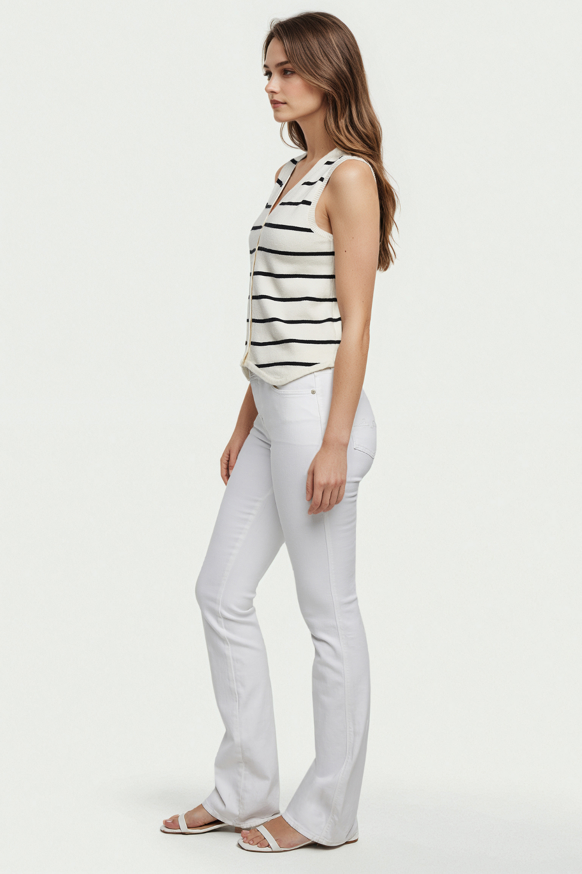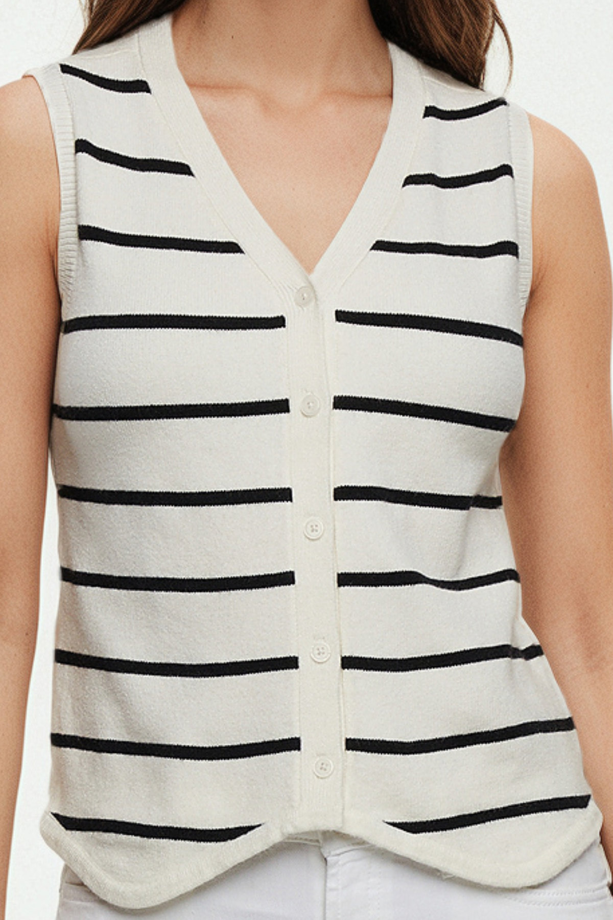 Fresh and fun, this sleeveless striped vest brings playful charm to any look. With sharp black stripes and a flattering V-neck button front, it’s perfect for sunny days, weekend strolls, or brunch with friends!