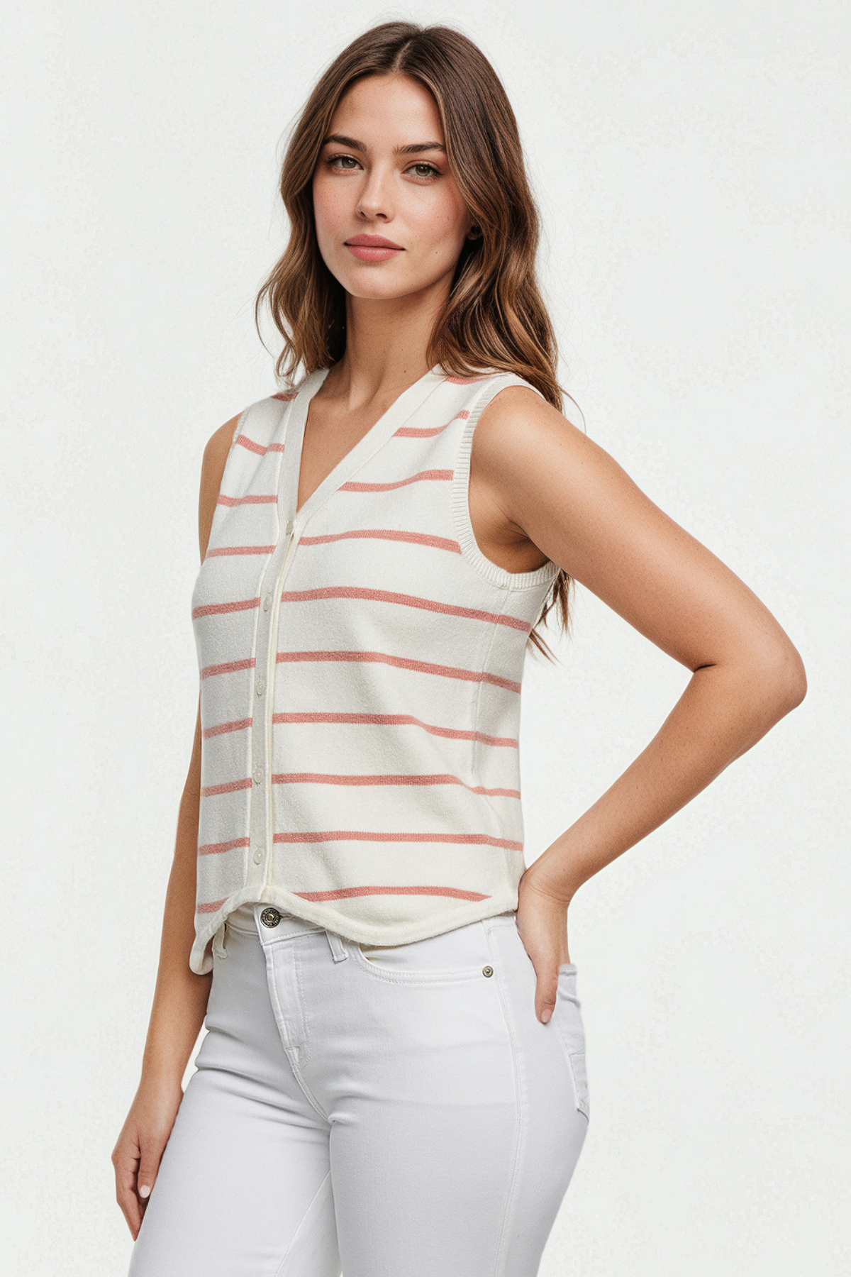 Fresh and fun, this sleeveless striped vest brings playful charm to any look. With soft pink stripes and a flattering V-neck button front, it’s perfect for sunny days, weekend strolls, or brunch with friends!