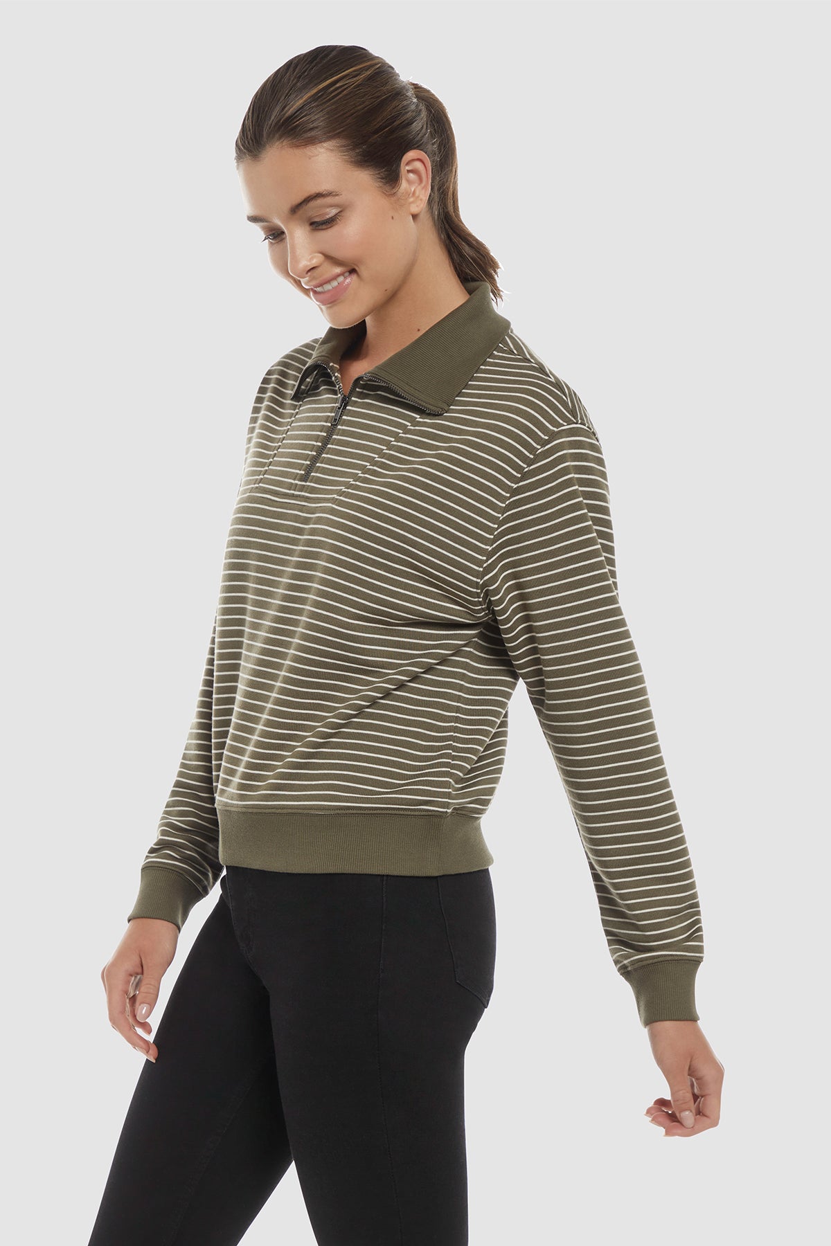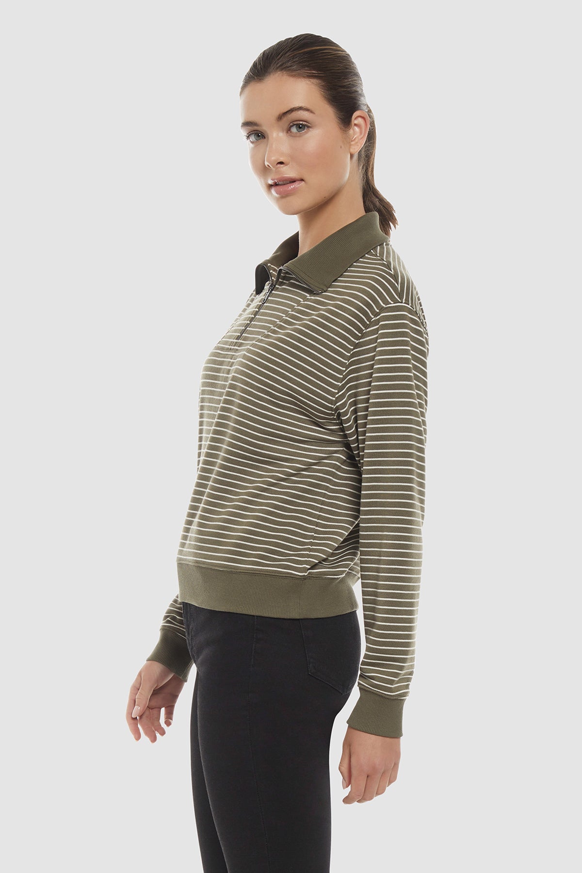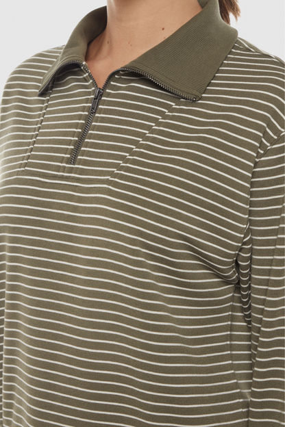 This striped cotton long sleeve tee is a wardrobe staple — the zip turtleneck and cozy silhouette are easy and comfortable.