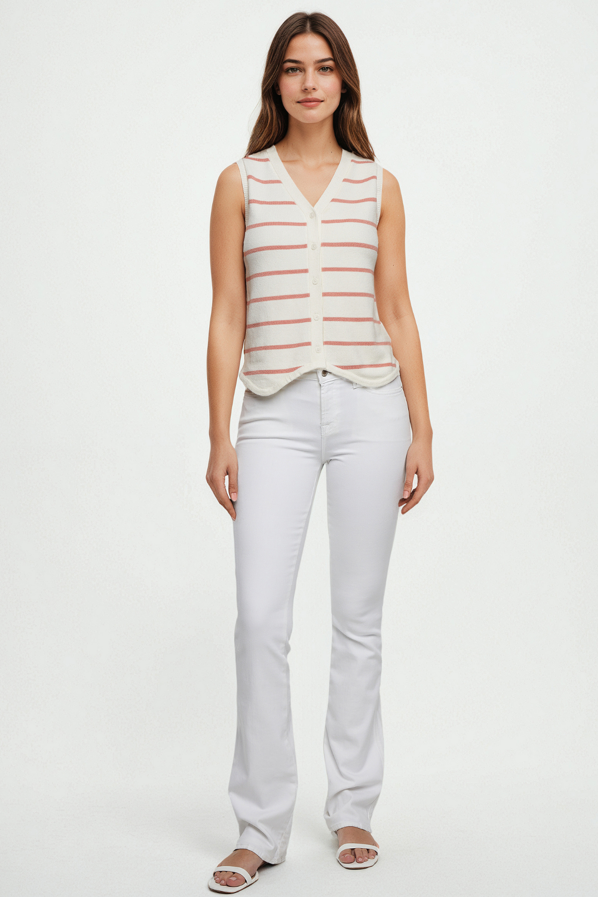 Fresh and fun, this sleeveless striped vest brings playful charm to any look. With soft pink stripes and a flattering V-neck button front, it’s perfect for sunny days, weekend strolls, or brunch with friends!
