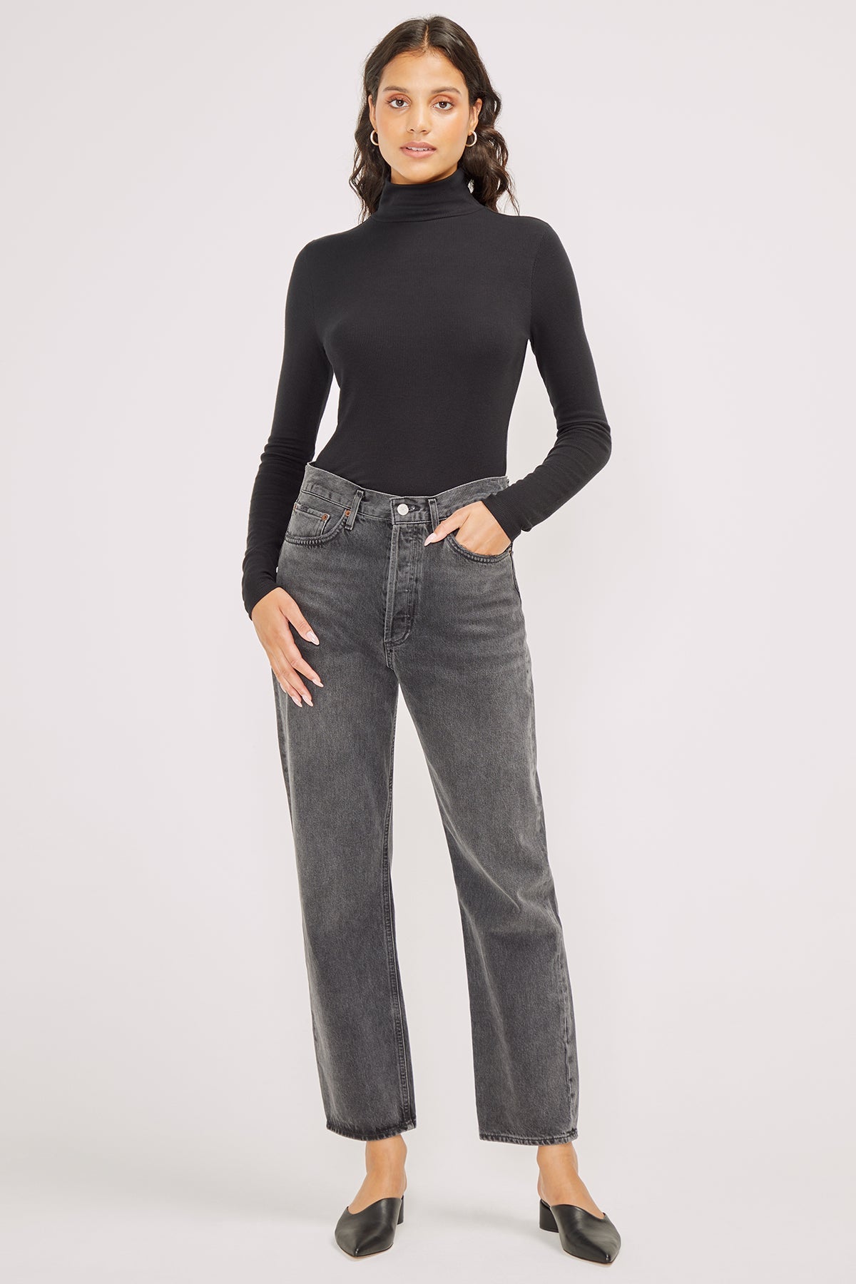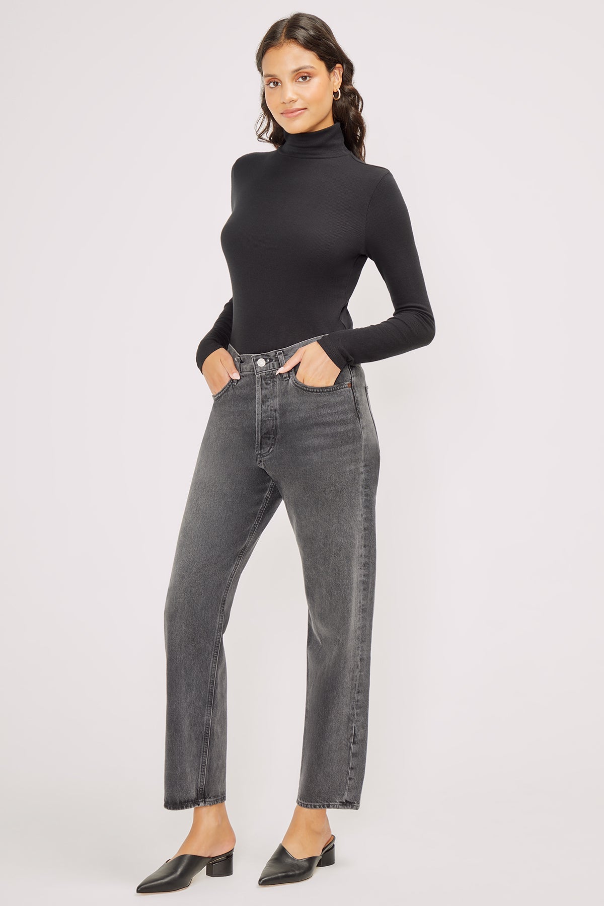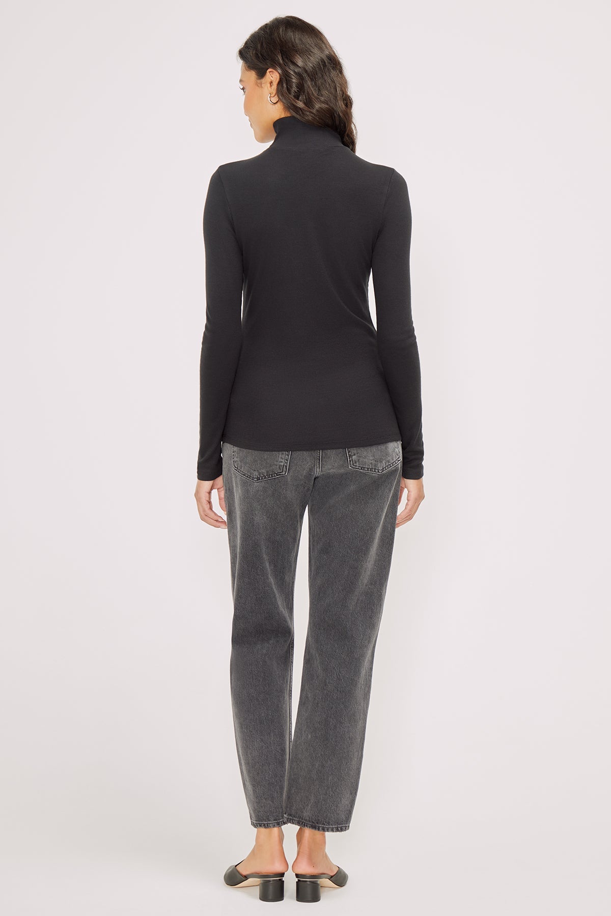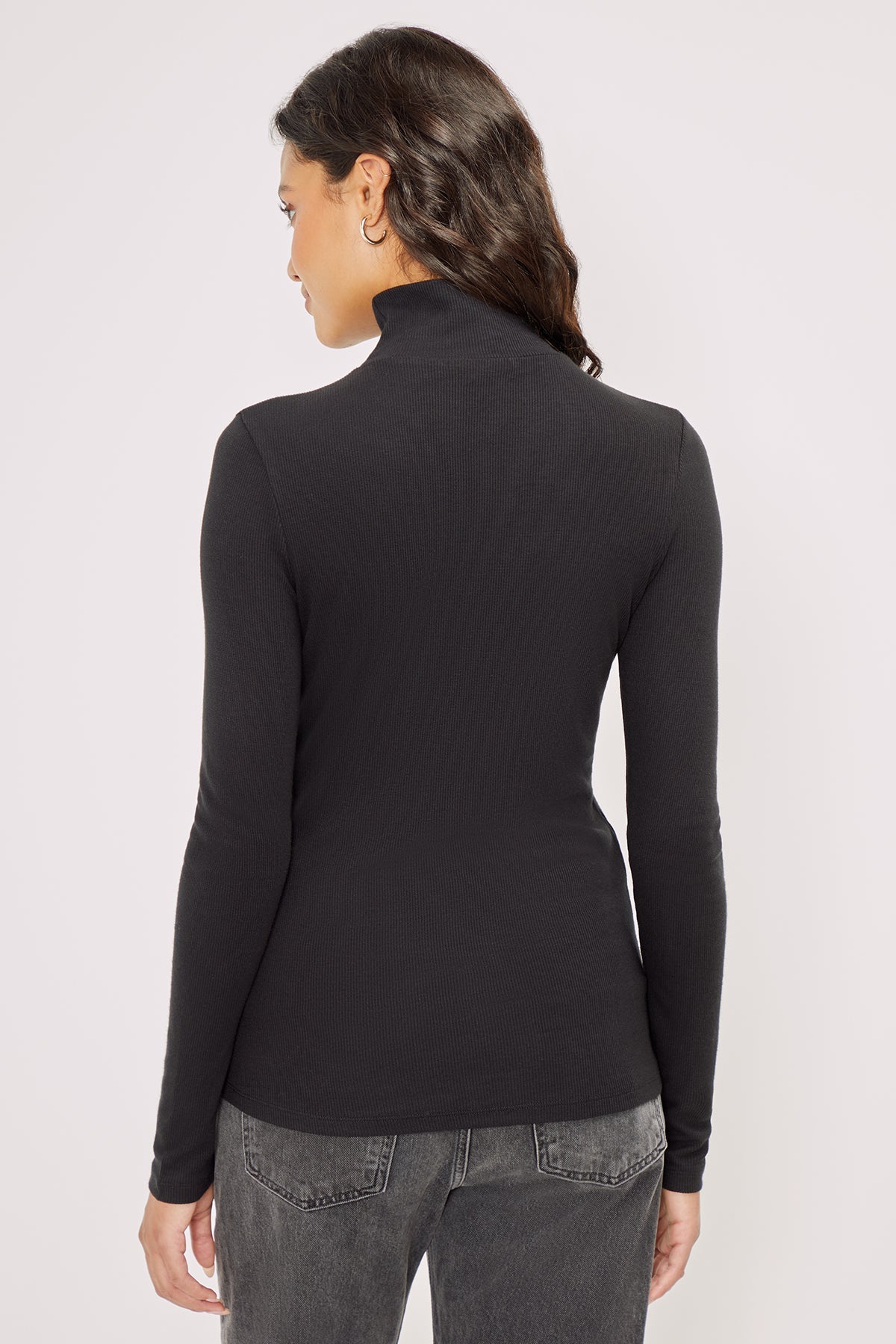 This ribbed piece is effortless and classic — with long sleeves, mock neck, and a complimentary silhouette, it’s just right for the season.
