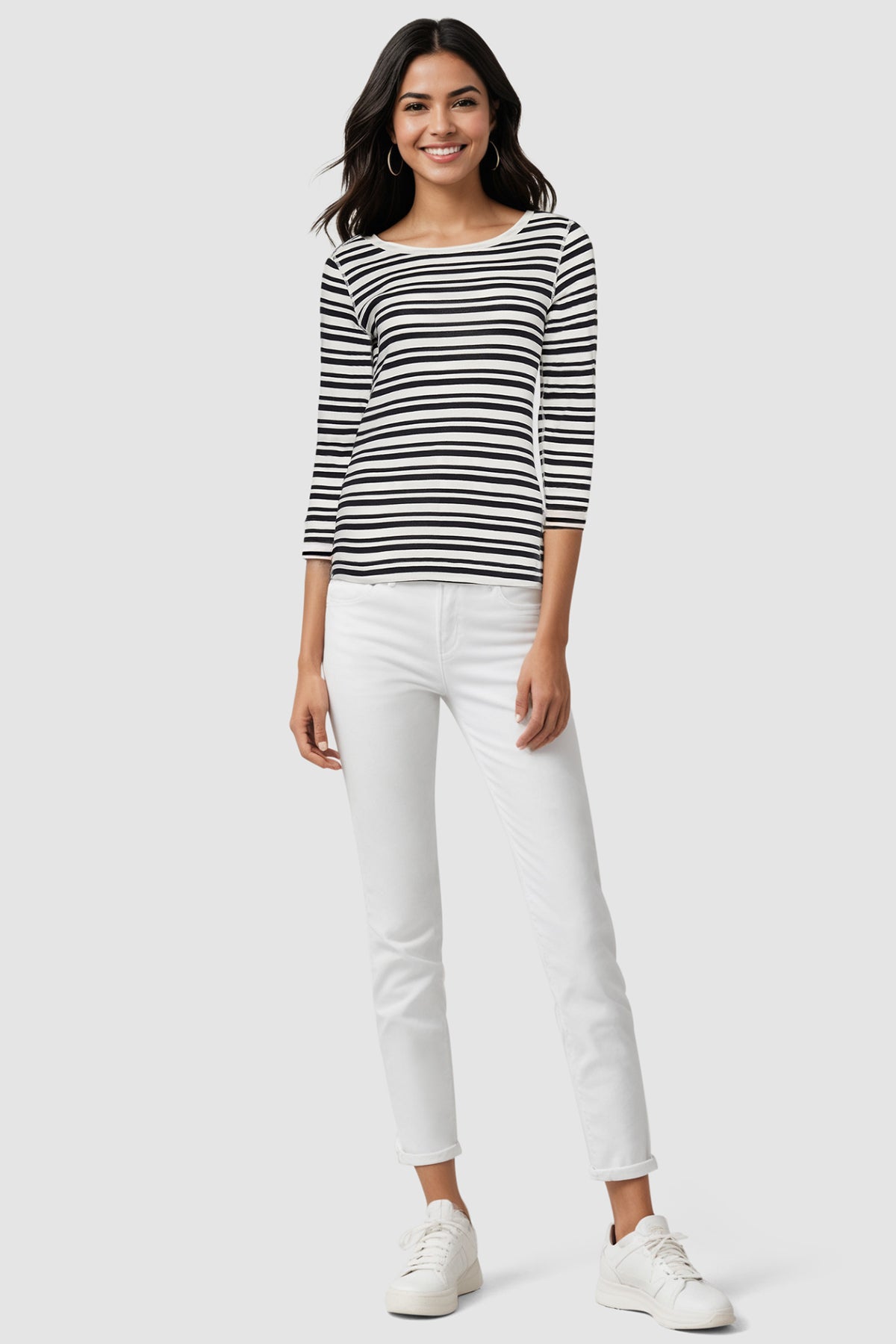 This easy cotton tee is a comfortable wardrobe staple with an elegant flair — featuring a boatneck, three-quarter sleeves, and a semi-fitted silhouette.