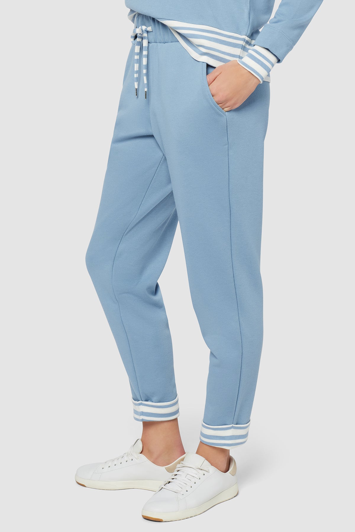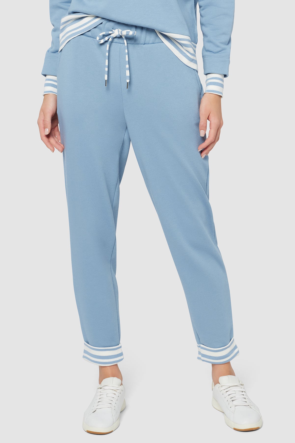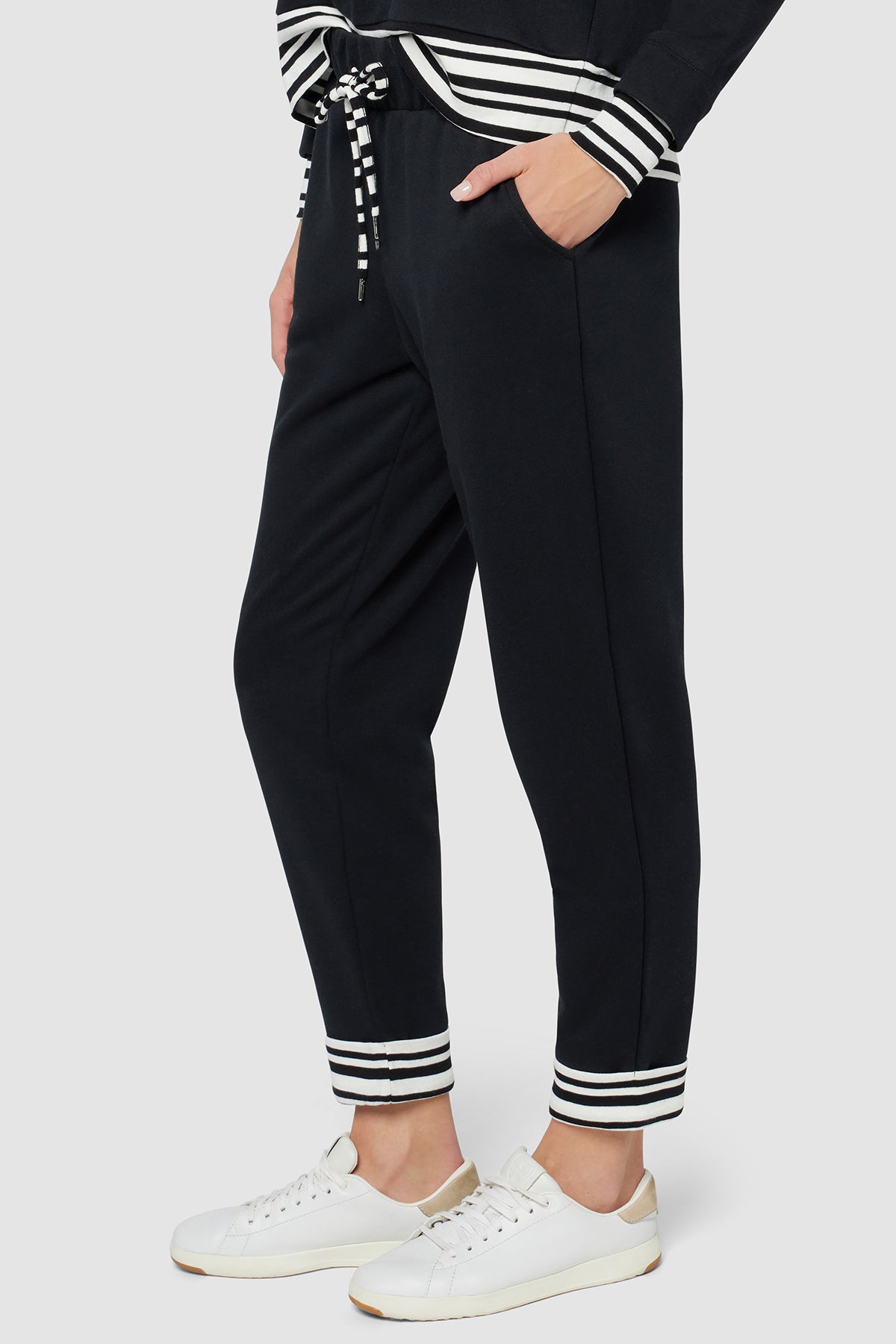 A sporty, relaxed fit cut from French terry, these soft, comfortable joggers feature handy side pockets, an elasticized waist with striped drawcords, and matching, tacked contrast cuffs.