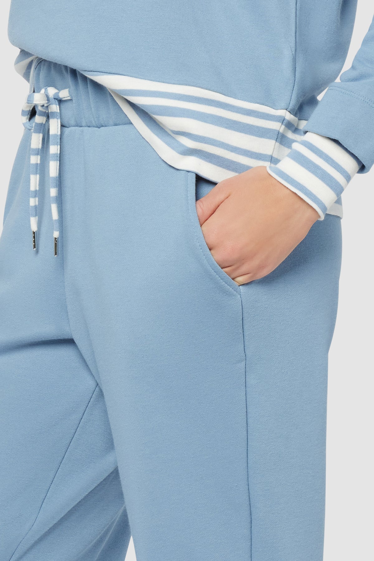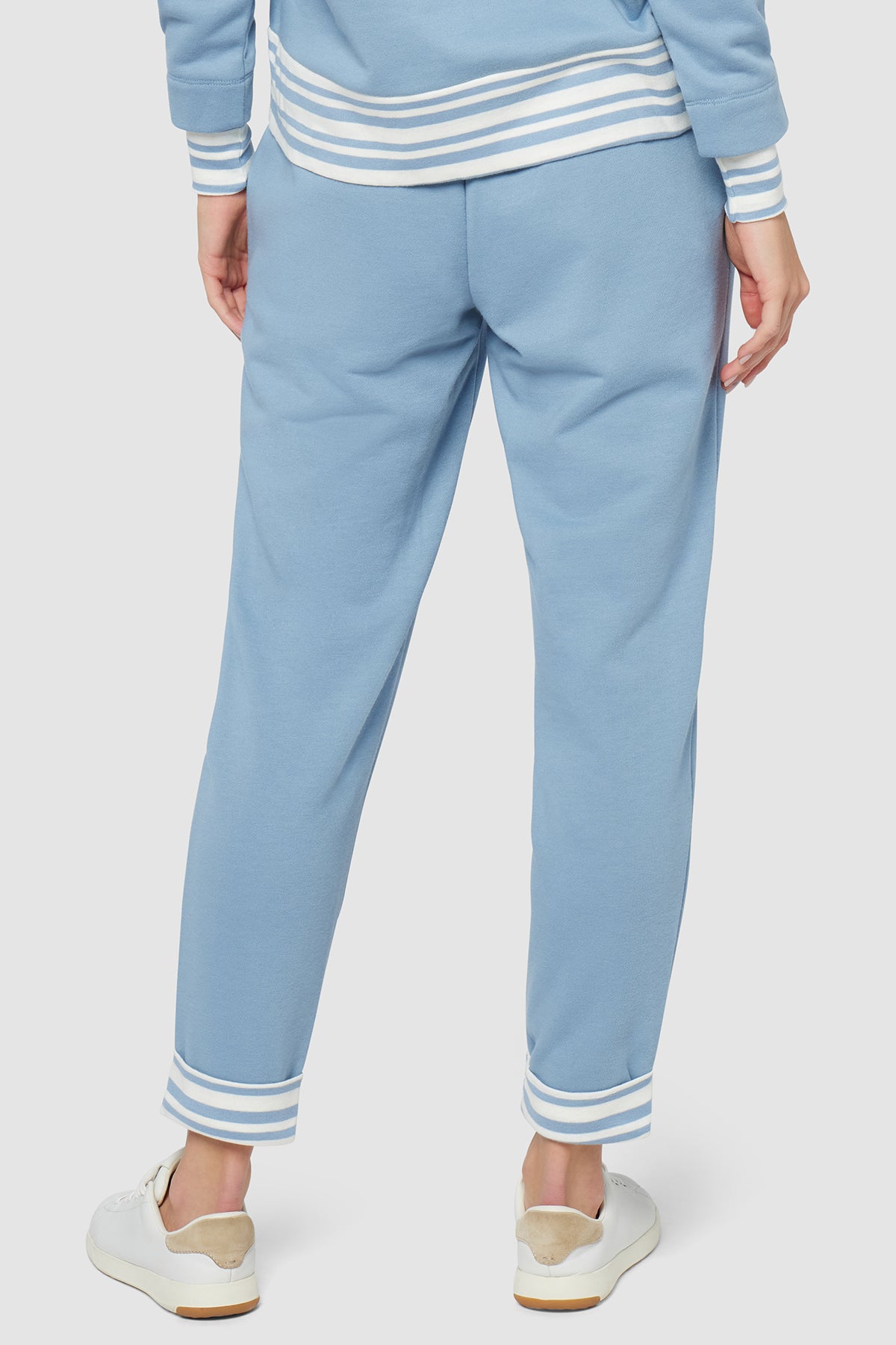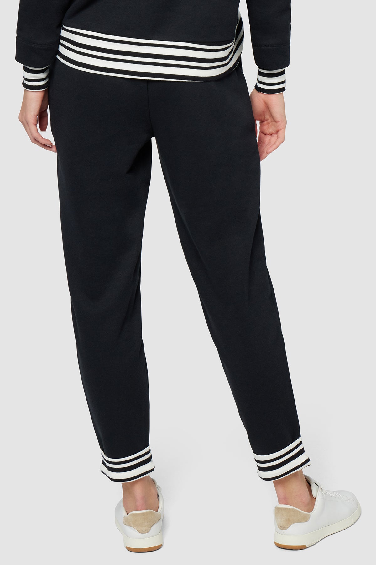 A sporty, relaxed fit cut from French terry, these soft, comfortable joggers feature handy side pockets, an elasticized waist with striped drawcords, and matching, tacked contrast cuffs.