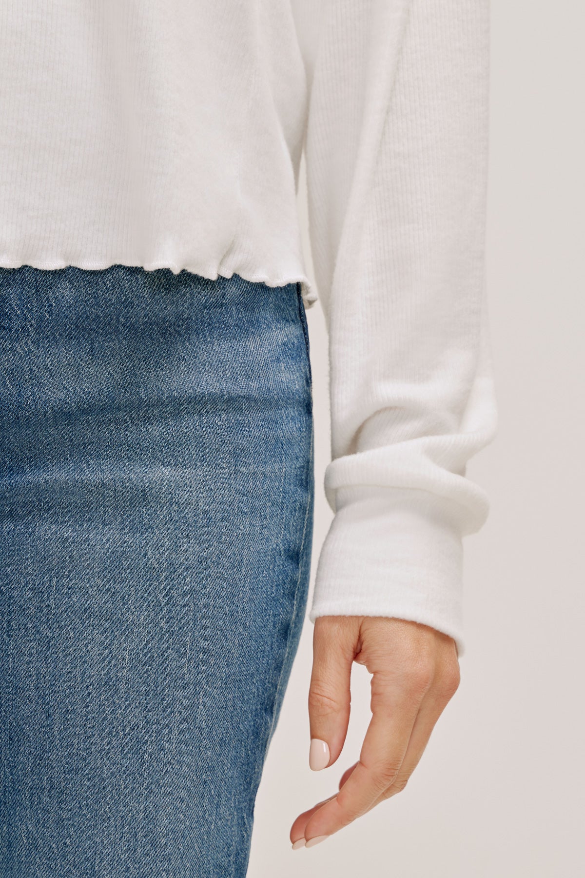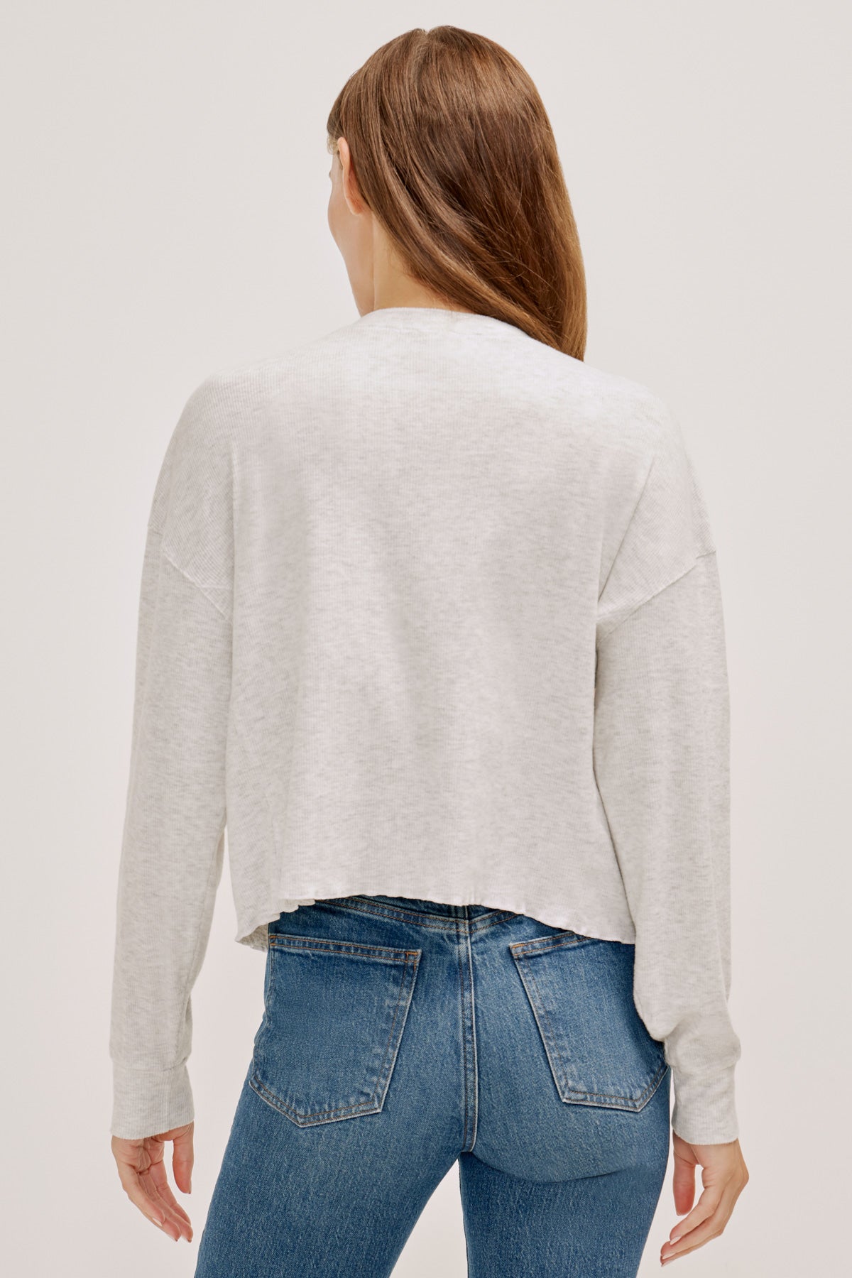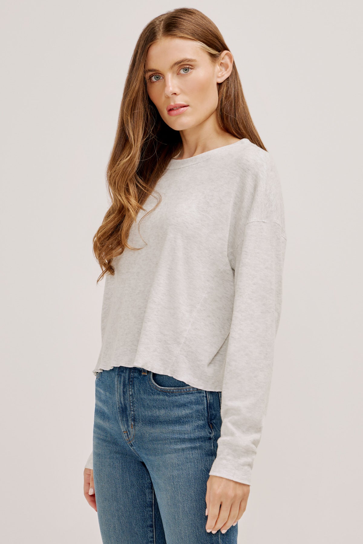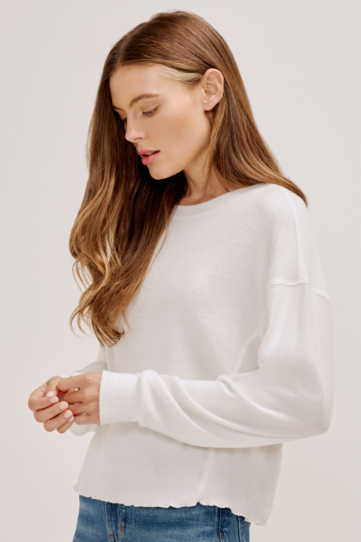 In a boxy silhouette and a slightly cropped length, this ultra-soft rib knit top features a stitched lettuce hem and roomy, dolman-style long sleeves, with dropped shoulders and banded cuffs.